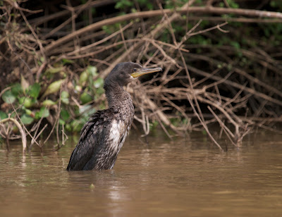 A 4Am start saw us hiding behind a blind of woven leaves overlooking a trapeang (forest pool) well before dawn. We ignored a calling Banded Broadbill in an attempt to stay quiet and wait for the ducks to come in, but by 7:30 it was starting to get hot and the constant White-breasted Waterhen parade was getting a little tiresome...at 7:45 we heard a quacking and looked up to see a single White-winged Duck flying overhead! Awesome to see the bird, but better views were required. Sony walked off to the other trapeang where one the community members was keeping watch...over a White-winged Duck! He ran back, fetched us we enjoyed this massive duck in the early morning sunlight. Later we taped in a calling Banded Kingfisher for poor views and saw some old elephant footprints.